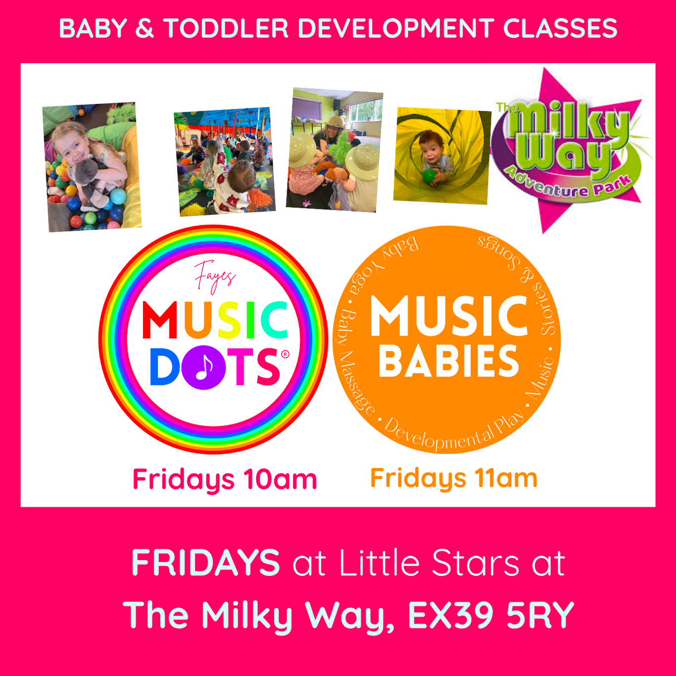 Fridays: Our baby and toddler development classes support childrens development with structured classes and activities. Includes FREE soft play at Little Stars at The Milky Way Adventure Park.
